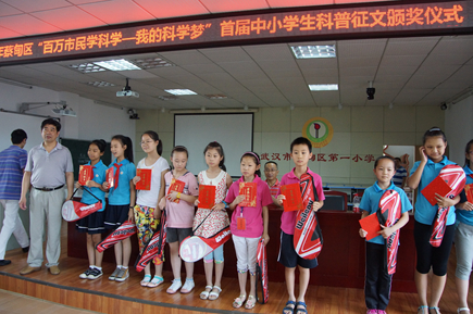 本次科普征文活动得到学校的支持及学生的响应,也取得了良好的效果,为及时总结此次活动成果,区教育局、区科协于本月25日上午,在蔡甸一小举行中小学生《我的科学梦》科普征文颁奖活动,出席活动的有区教育局副局长刘银桥、区教育局电教站黄、区科协副主席刘爱武、调研员刘汉春以及130多名学生代表等。会上对获奖学生进行了颁奖,区教育局副局长刘银桥、区科协调研员刘汉春分别作了热情洋溢的讲话。