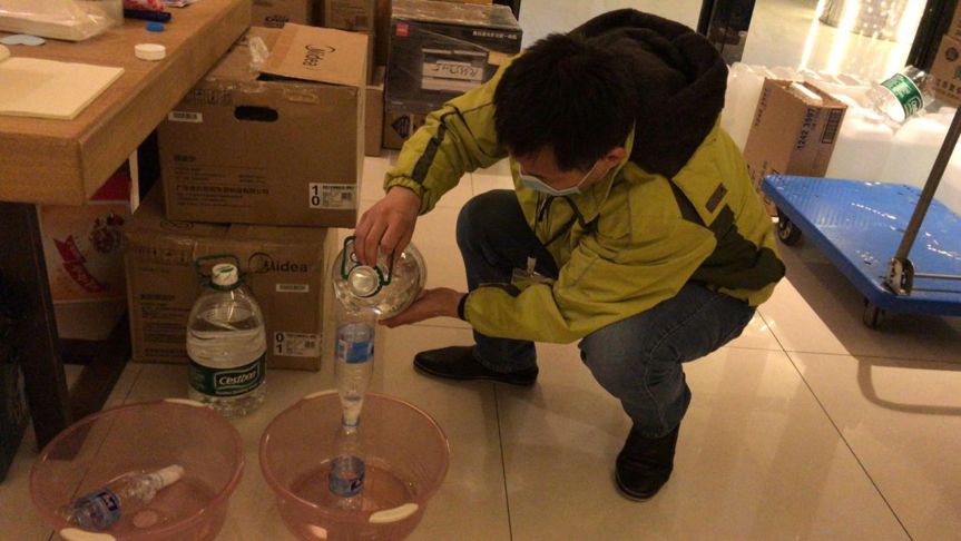▲21日下午,前往区防疫指挥部领取到手消、洗衣粉等物品,分别放置在酒店的3个楼层供医护人员使用。