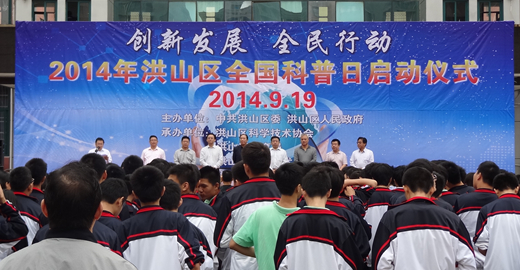 9月19日上午9:30时,2014年洪山区全国科普日活动启动仪式在洪山高中举行。省科协普及部部长余永东,市科协副主席陈光勇,洪山区委常委、宣传部长万磊,区政府副区长杨海松、区政协副主席王树忠等省、市、区领导出席了启动仪式。区政府副区长杨海松主持仪式。区科协、区教育局、区科技局和洪山高中负责人,洪山地区科普展教联盟各成员单位的领导,洪山区各街乡科协秘书长、社区科普员以及洪山高中的同学们近800人参加了本次活动。
