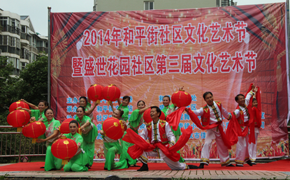 9月13日上午九点半,在这个清爽怡人的季节里,2014年和平街社区文化艺术节暨盛世花园社区第三届艺术节文艺汇演终于在社区文化广场拉开了帷幕。活动吸引了盛世花园社区管辖的三个小区1000余名群众前来参加。
