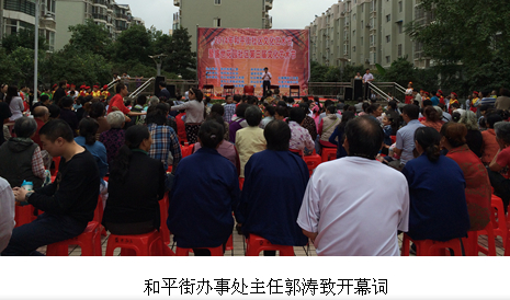 文艺汇演首先由和平街办事处主任郭涛上台致开幕词,盛世花园社区书记兼主任胡波宣布正式开始。