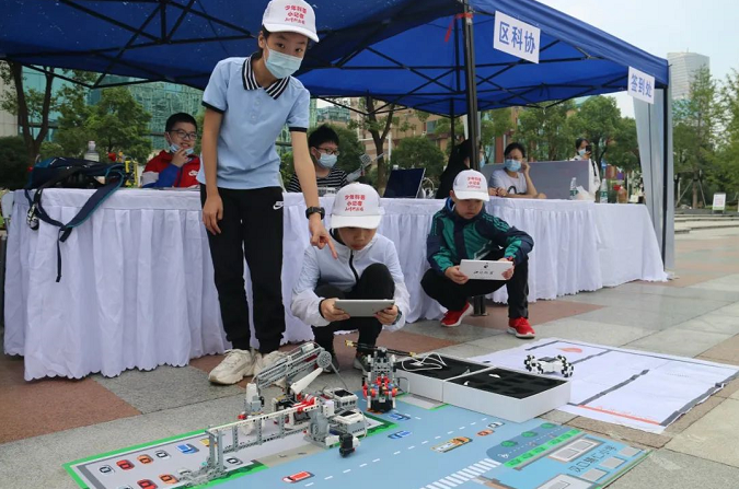 进攻、避让……一场热血沸腾的机器人“争霸赛”吸引了众多学生围观,本报小记者也受邀参加。几平方米大小的赛场上,两个“铁甲”机器人正在激烈比赛,遥控它们的是来自汉口辅仁小学的小记者祁佶和程郑浩江。已经上六年级的两位小记者从三年级就开始在学校学习创意编程和机器人,曾参加2019年全国机器人比赛(睿杭)机器人总决赛,获得二等奖。能参加这样的活动他们觉得很有意义。在遥控器的指挥下,憨态可掬的机器人舞动起手臂,跳出“太空步”,还能变幻“歌喉”……祁佶拿起一个机器人向周围居民演示说:“很有意思,汽车、飞机等模型都可以通过电线、器件等材料组装出来,还能通过蓝牙或者平板操控,还能发射炮弹。”辅仁小学的詹斌华老师表示,课内外的实践活动能培养孩子热爱科学的兴趣。