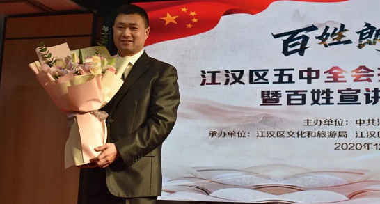 “今天的活动,通过诵读赛+分享感悟的形式,不仅针对性强,而且通俗易懂,对理解领会党的十九届五中全会精神实质、核心要义、丰富内涵作了很好的诠释……”在参加五中全会报告摘要诵读赛时,江汉区政府副区长张智勇进行现场点评。