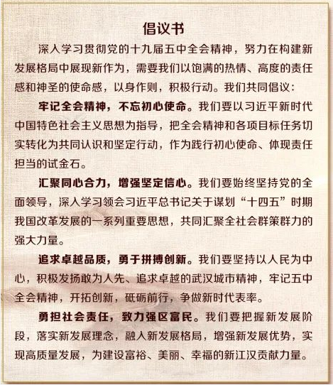 为深入贯彻落实习近平总书记重要指示精神,江汉区科协联合区文旅局、工商联 等单位,面向辖区广大企业家、科技工作者、文化界群体代表,组织开展五中全会精神百姓宣讲主题活动,通过全会精神篇章诵读比赛方式,引导广大干部群众立足岗位,从把握新发展阶段、贯彻新发展理念、构建新发展格局的高度,深刻领会十九届全会的精神实质,为建设国家现代服务业示范区,构筑富裕活力美丽幸福的新江汉而共同奋斗。
