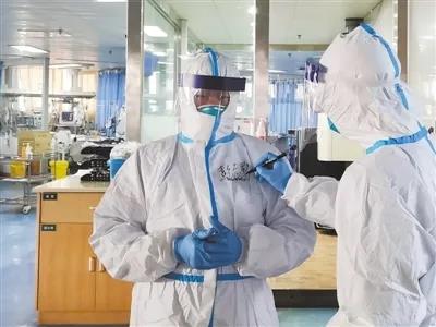 2月5日,武汉大学中南医院重症医学科主任彭志勇(左)走进隔离病房准备救治患者。新华社发(钟南轩摄)