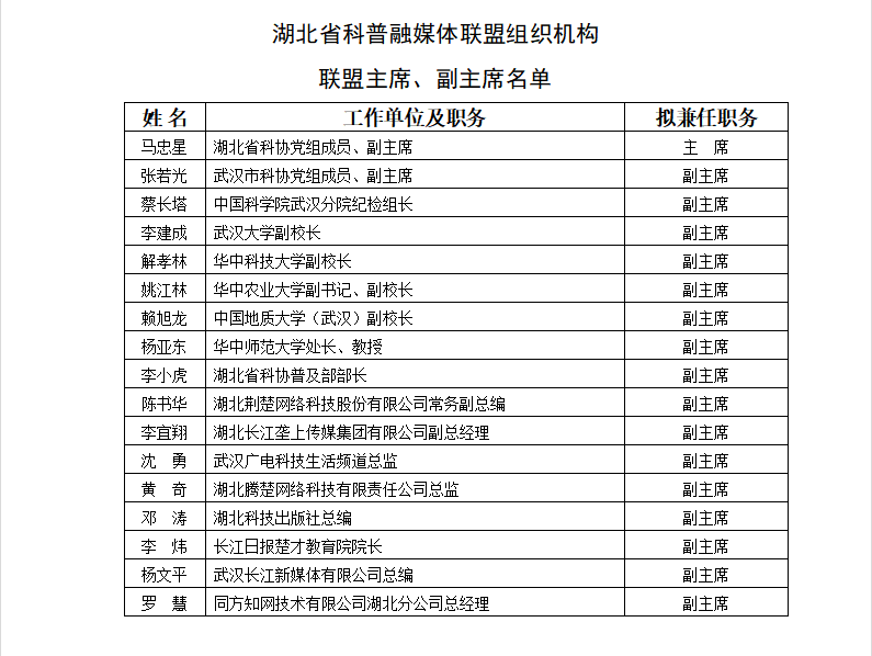 会议审议并通过了《联盟章程》、联盟主席、副主席建议名单,以及联盟联络中心主任、副主任建议名单。联盟主席由湖北省科协党组成员、副主席马忠星担任。