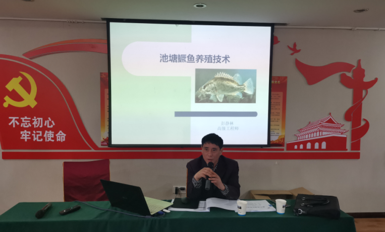 培训邀请了高级工程师彭静林给周边50余水产养殖大户讲解了“池塘鳜鱼养殖技术”。彭专家详细讲解了鳜鱼养殖的发展趋势、技术进展、存在的问题、模式效益和具体的养殖技术。