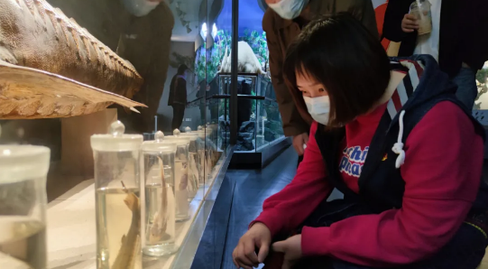 在华农博物馆,一级保护动物中华鲟的标本吸引了大家目光,两个中华鲟标本静静地“躺”在玻璃窗内,但是身躯依然饱满似含有无限活力,足以令人畅想其在长江中畅游的景象。讲解员介绍,展柜中的这两条是雌性中华鲟,长江流域的渔民间流传的一句谚语,“千斤腊子万斤象,黄排长大不像样”,其中“腊子”指的就是中华鲟。