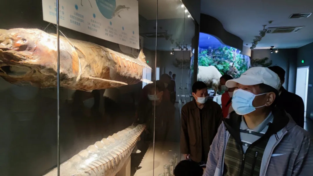 在华农博物馆,一级保护动物中华鲟的标本吸引了大家目光,两个中华鲟标本静静地“躺”在玻璃窗内,但是身躯依然饱满似含有无限活力,足以令人畅想其在长江中畅游的景象。讲解员介绍,展柜中的这两条是雌性中华鲟,长江流域的渔民间流传的一句谚语,“千斤腊子万斤象,黄排长大不像样”,其中“腊子”指的就是中华鲟。