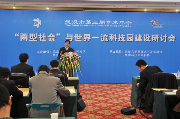 武汉市第三届学术年会第八分会场“两型社会与世界一流科技园区建设研讨会”于11月21日下午在武汉东湖新技术开发区会议中心举行。来自市直有关部门、东湖新技术开发区、部分企业、有关大专院校、市科协系统等200多人参加了报告会。会议由东湖新技术开发区管委会科协主席俞毓林主持,华中科技大学副校长邵新宇致贺词,市政府副秘书长唐惠虎讲话。