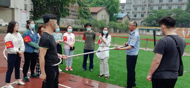 本次防爆科普演练主要以反恐防暴器械使用方法和模拟演练的形式进行。颜警官现场教学学校门卫人员及老师如何正使用防暴器械,懂得在危险来临时,如何保护学校师生生命财产安全。