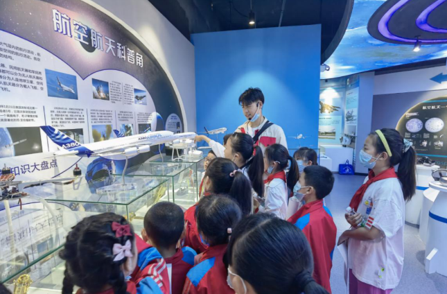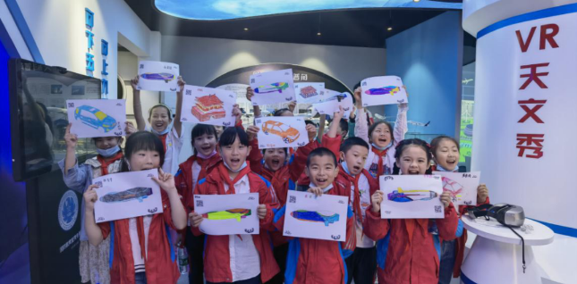 随后,学生们走进南湖航空航天科技馆,观看了馆内歼15舰载战斗机、长征系列火箭、神舟载人飞船等各种航空航天模型,体验了模拟飞行、9D VR、航天知识竞答、虚拟运动会等项目,并在老师的帮助下制作了“南湖红船”、“北京天安门”等模型,以寓教于乐的方式向青少年普及党史和科学知识,感受伟大祖国的发展成就。