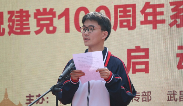 来自武汉中学高二2班的刘佳康同学,作为学生代表做主题为“学党史 爱祖国 爱科学 用科学”倡议发言。