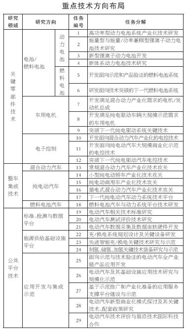 “十二五”电动汽车科技发展重点任务是:紧紧围绕电动汽车科技创新与产业发展的三大需求,继续坚持“三纵三横”的研发布局,突出“三横”共性关键技术,着力推进关键零部件技术、整车集成技术和公共平台技术的攻关与完善、深化与升级,形成“三横三纵三大平台”战略重点与任务布局。(重点技术方向布局见图表)