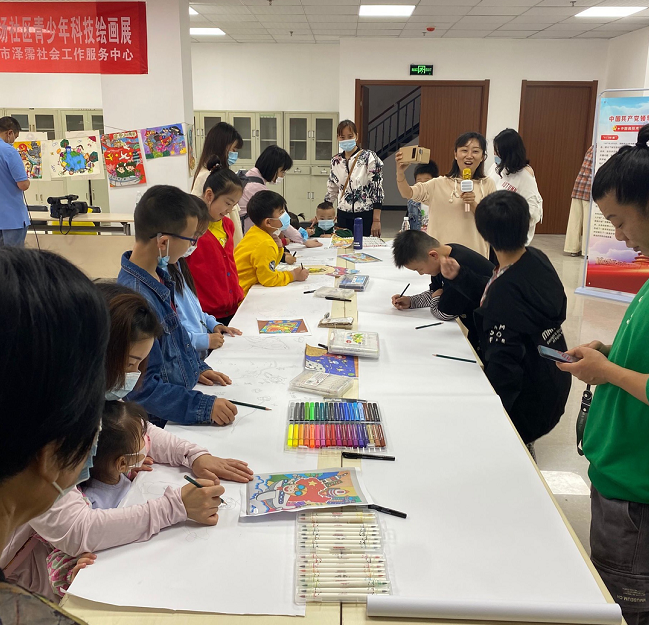缤纷的色彩,五彩的长幅,青少年们用自己的画笔在长幅纸上绘画,描绘自己眼中的“科技祖国”,用这样独特的方式为党献礼。活动中还展出了一幅幅以科普幻想为主题的画作,孩子们用各种颜色描绘出自己心目中的科技科学,人工智能、宇宙世界、科技创新……