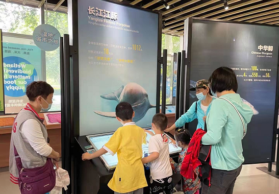 下午3点在社区集合签到后,一起乘车前往活动地点,今天的目的地是解放公园湿地科普馆,这也是武汉中心城区首座湿地科普馆。入馆后,社区科普志愿者带领大家参观科普展示厅,展示厅以图片、视频、标本的形式普及湿地保护知识。展墙上还有4个小抽屉暗藏玄机,抽屉拉开后,引得孩子们阵阵惊呼,一个个由仿真材料制作的小生物栩栩如生地呈现在眼前:螃蟹在沼泽地里爬行,鱼在水草丛中游行,田螺在水沟里休憩,青蛙在荷花池中鼓鸣……趣味十足,仿佛身临其境。
