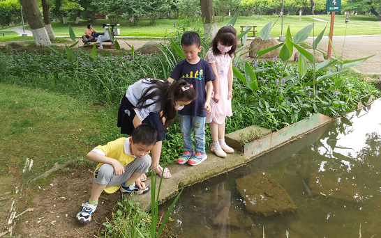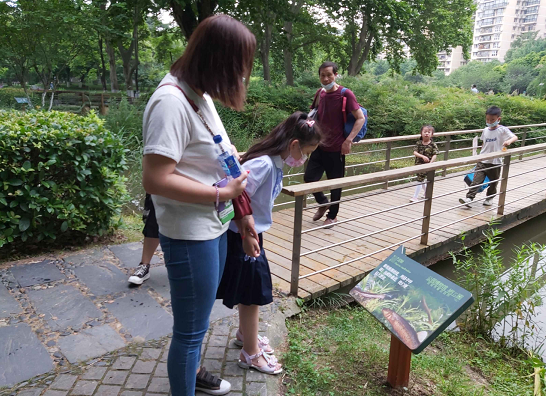 初步了解湿地的相关知识后,大家来到室外,感受这一富有天然情趣的自然景观——生态湿地。走在水池的廊桥上,茂盛的水生植物触手可及,廊桥下淤泥里密密麻麻的小田螺,水池里时不时晃过的小鱼身影,池边用毛线钓虾路人,都吸引着孩子们驻足观看,有的小朋友还坐下来画下自己看到的风景。湿地的小路旁树立着很多趣味科普牌,上面有着湿地动植物的图文介绍,孩子们沿着科普牌,在附近寻找牌子上的主角,有扇动翅膀的蝴蝶、风驰电掣的蜻蜓,甚至还看到了国家二级保护动物戴胜鸟。