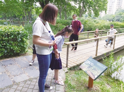 走近湿地的趣味科普牌,孩子们沿着科普牌,在附近寻找牌子上的主角:有扇动翅膀的蝴蝶、风驰电掣的蜻蜓,甚至还看到了国家二级保护动物戴胜鸟。一年级的祁子清同学说:“湿地的功能太丰富了,不仅能净化水质,还是很多小鸟的家。”