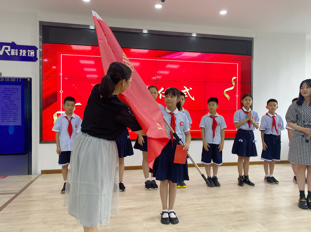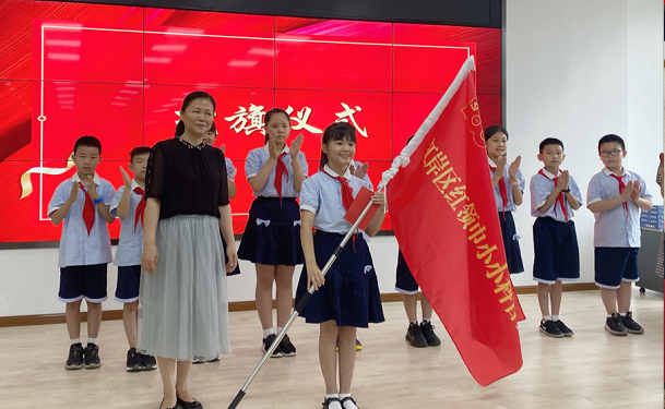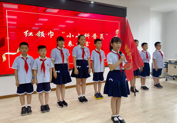 罗玉清向红领巾“小小科普员”代表——育才怡康小学四年级(3)黄盈瑄同学授旗,并宣布江岸区小小科普员队伍正式成立。