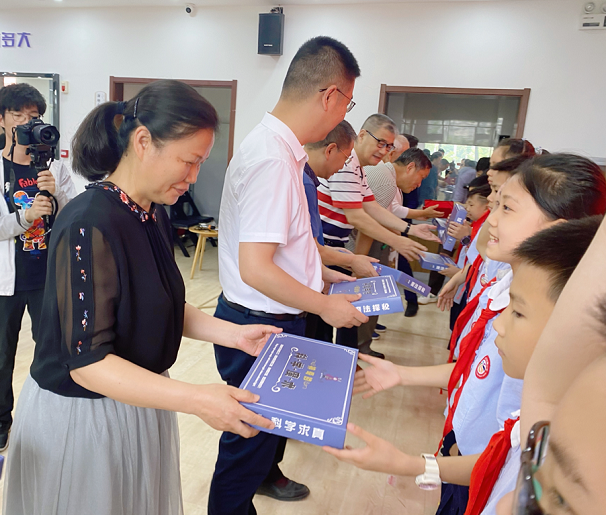 与会嘉宾向红领巾小小科普员颁发荣誉证书和学习记录手册。