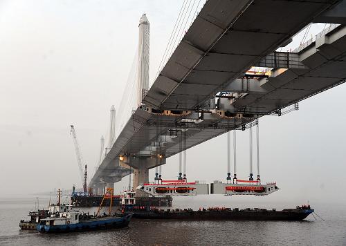 2月3日,随着四台桥面吊机缓缓起升,嘉绍跨海大桥最后两片钢箱梁从水面顺利起吊至40米高的桥面,这也标志着全桥的箱梁吊装全部完成。嘉绍跨海大桥全长2680米的主航道桥部分建成以后,将是世界上最长最宽的多塔斜拉桥,主通航孔满足通航3000吨级集装箱船的需要。目前世界上最长的多塔斜拉桥是法国的米约高架桥,全长2460米。图为每片重达408吨的钢箱梁缓缓吊向桥面。新华社记者徐昱摄