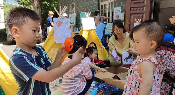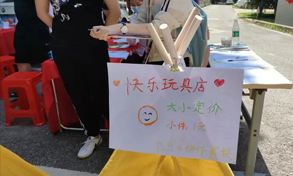 当天上午9时许,水生村社区服务中心前的小广场上便陆续支起了一个个色彩鲜艳的小帐篷,小朋友们纷纷化身摊主,将闲置的玩具、书本等摆至摊位进行置换、义卖。为了推销自己的商品,小朋友们使出浑身解数,用水彩笔等绘画材料为自己的摊位DIY店名和logo海报进行宣传,一时间引来无数“生意。