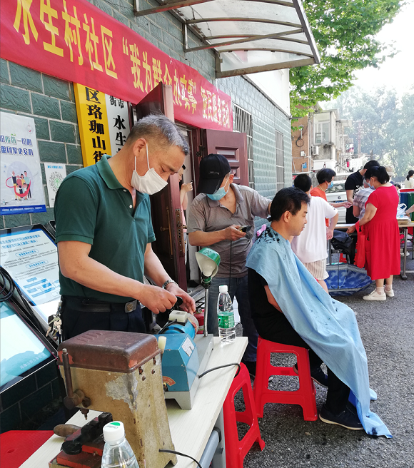 除了以上摊位, 便民服务摊位也人气爆棚,不一会儿就吸引了百余名社区居民的参与。许多居民来到现场体验免费理发、修鞋、磨刀等优质服务,师傅们精湛的手艺,让居民们心满意足,活动现场不时响起欢快的笑声。