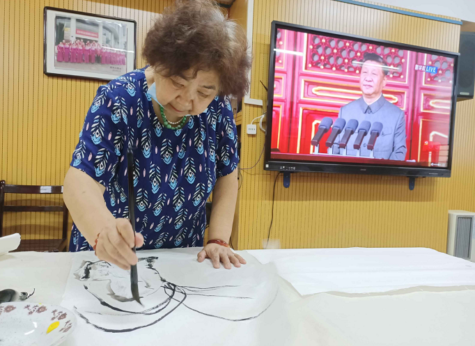 展会现场,大家一边欣赏作品,一边交流心得,切磋技艺,书画爱好者们现场作画,会场呈现出一片祥和融洽的氛围。书画研究会秘书长黄锦云酷爱书画,从展览策划、作品收集到人员组织,她积极筹备、精心安排,为了本次展览,她准备了4幅歌颂党史的书画作品,“我将永远保留这些画作,保留党史印记,以后还会将这些书画传给后代们,希望他们能从中汲取力量。”