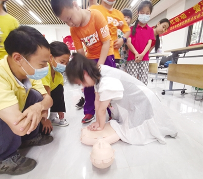 “水中抽筋了怎么办?”“落水如何自救?”邝老师结合生活实际,就怎样预防溺水、如遇溺水事故如何求救等问题进行了生动的讲解。为了让学生掌握正确的溺水自救、自护要领及救助他人的方法,邝老师让未成年人边模拟演练,边详细讲解了溺水自救、落水救助和岸上急救等现场救护方法。
