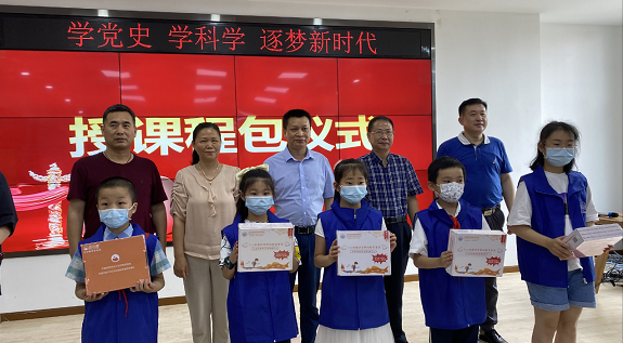 当天,现场领导们为学生代表授课程包。沈阳路小学金易周发言说,作为一名小学生,要勤学思敏,用科学知识武装头脑,开拓认知,从小打下坚实的科学知识基础,为祖国争光添彩。
