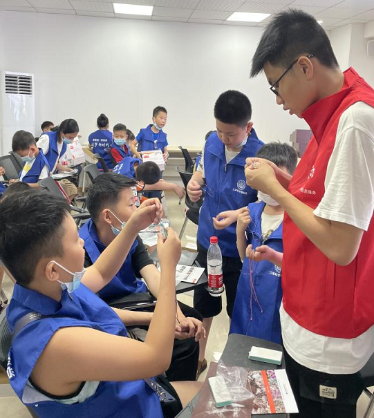 小朋友们在老师和科普志愿者的指导下动手设计、制作宝石饰品。