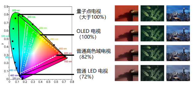 量子点是一种纳米级别的半导体材料,其发出光的频率会随着这种半导体尺寸的改变而变化,因而通过调节这种纳米半导体的尺寸就可以控制其发光的颜色。同时,改变材料的组成元素也可以对发光进行调控,使色彩更加丰富。