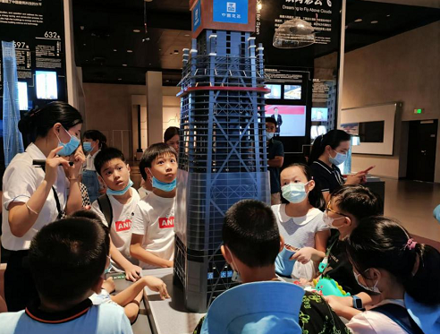 以古为镜,可以知兴替。学习历史是为了更好的走向未来。来到现代建筑展厅。讲解员向孩子们介绍到,如今的我们已经拥有高空吊塔技术,依靠科学进步成功的修建了世界第二高建筑上海中心大厦,可以说是真正做到了“手可摘星辰”