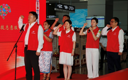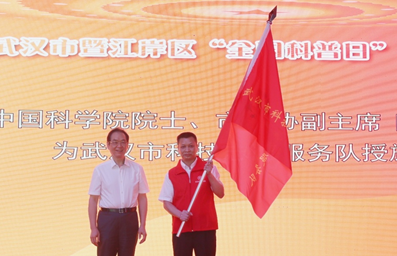 陈孝平院士为武汉市科技志愿服务队授旗,科学普及部彭竹春作为代表接旗。