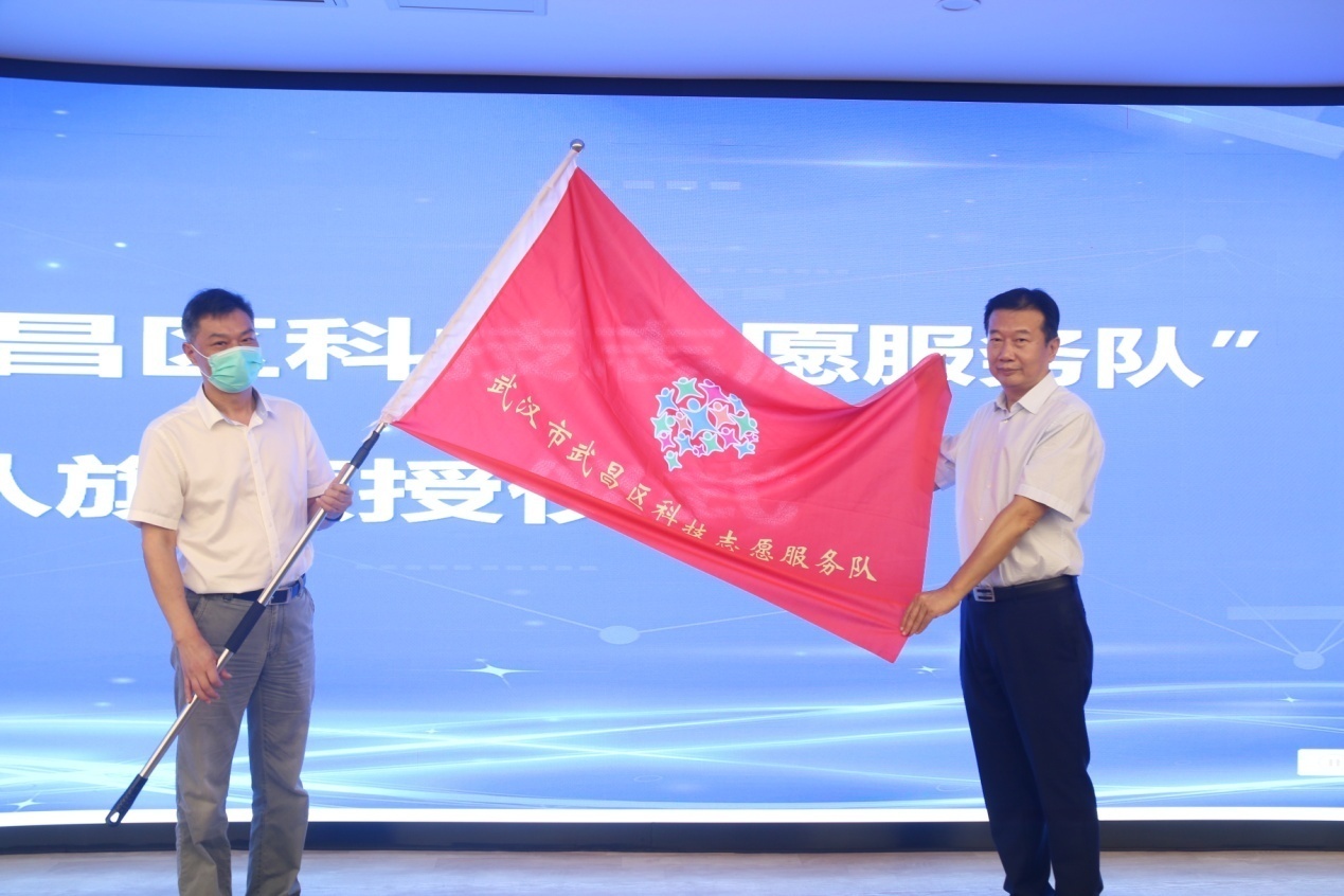 图为袁艳斌为“武汉市武昌区科技志愿服务队”授旗。