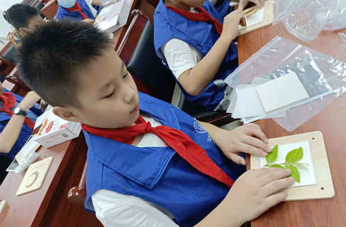 最开心的环节便是地大老师为参与小朋友都准备了一份科普包,老师指导学生从修整、压制、贴标签、保存四个步骤自己动手制作标本,最后属于自己的标本就完成了,随后还评选出了“标本小达人”并合影。