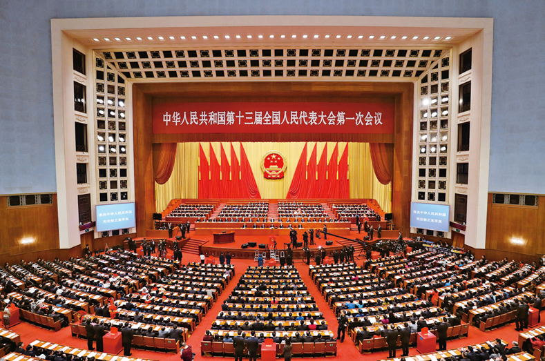 2018年3月11日,十三届全国人大一次会议在北京人民大会堂举行第三次全体会议,表决通过《中华人民共和国宪法修正案》。这次修改宪法,在宪法序言确定党的领导地位的基础上,将“中国共产党领导是中国特色社会主义最本质的特征”写入总纲。图为十三届全国人大一次会议第三次全体会议会场。