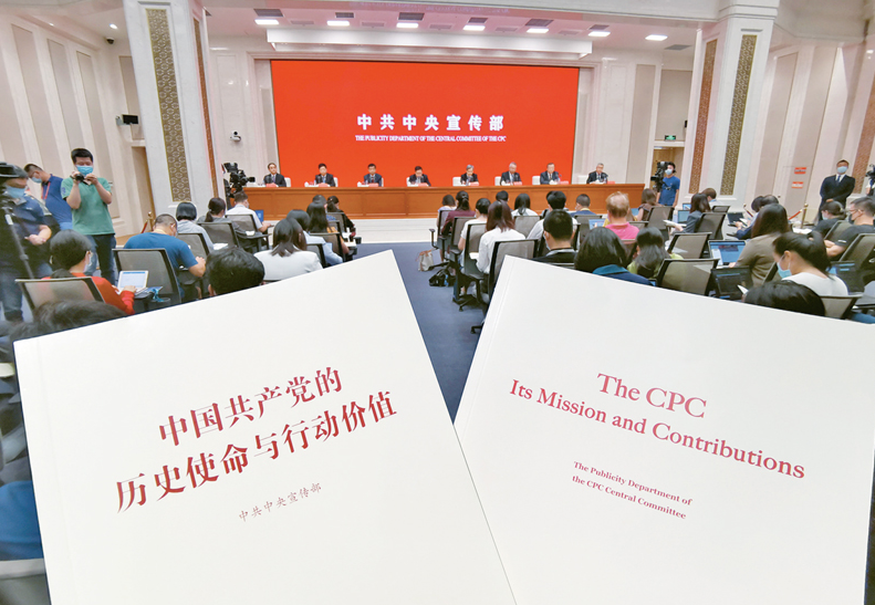 2021年8月26日,中共中央宣传部在北京发布文献《中国共产党的历史使命与行动价值》。文献以习近平总书记“七一”重要讲话精神为指导,全面介绍中国共产党的百年奋斗历程,深刻阐释党的治国理政理念、实践和成就。图为文献《中国共产党的历史使命与行动价值》中文版和英文版。