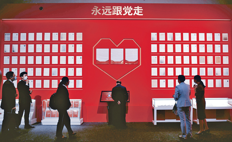2021年5月24日,“众心向党 自立自强——党领导下的科学家”主题展在北京中国国家博物馆开幕。图为开幕当日,人们在观看钱学森等100位科学家的入党志愿书。