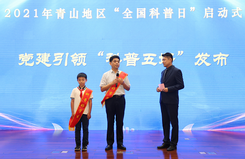 青山区委副书记、区委政法委书记雷利军,区人大副主任董俊,区人民政府副区长周斌,区政协副主席刘韧给青山区10位“最美科技工作者”代表、10位“科普五好”代表授绶带。