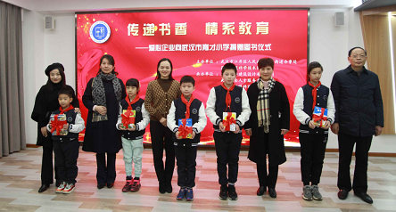 来自武汉人才集团有限公司、武汉正华建筑设计有限公司、武汉源全人才服务有限公司、武汉艾格眼科医院、汉口银行股份有限公司营业部等5家爱心企业的代表现场举行捐书仪式,育才小学的少先队员们为企业家代表敬献红领巾,并颁发捐赠证书。