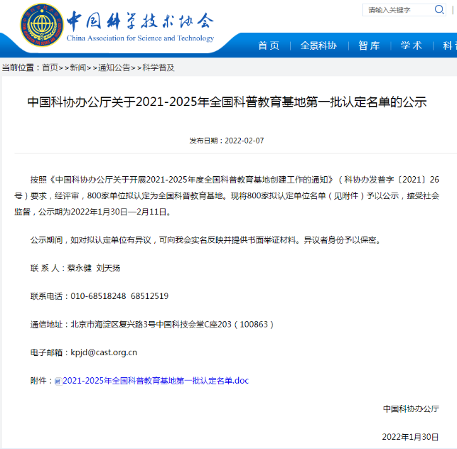 此次入选的800家单位由《全民科学素质行动规划纲要(2021-2035年)》实施成员单位、全国学会(协会、研究会)、省(自治区、直辖市)科学技术协会三类单位推荐,经过初评、终评脱颖而出,在公示无异议后,将由中国科协予以认定命名“全国科普教育基地”并颁发证书和牌匾。