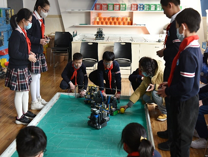 学校创客教育始于2018年,目前已形成三阶梯队相互承接又各自独立的基本规模,立足培养学生科创意识,为信息化时代储备人才,使学生成为未来高新技术的主力军。第一梯队依托乐高积木(wedo2.0)吸引二、三年级小朋友的兴趣,培养想象力和逻辑思维能力,初步认识机器人的整体构造。第二梯队以AI智能机器人为载体,以赛带训,实践机器人拼装、编程完成项目,初步接触人工智能。第三梯队以VEX机器人工程挑战赛和Scratch编程为平台,引导学生对机器人和机器语言的学习和应用,锻炼学生研究、协作、应变等综合能力。几年来,学校创客比赛战绩斐然,向中学输送了一批科技小精英。
