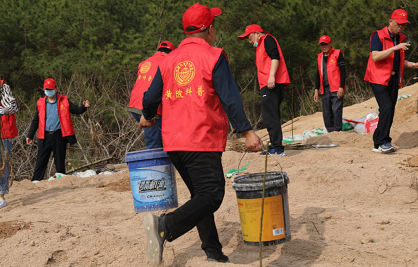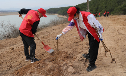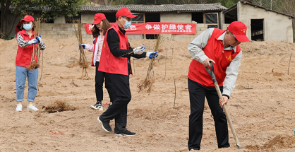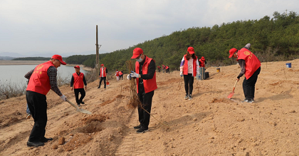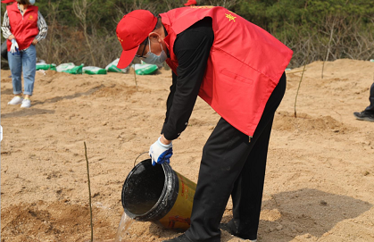 植树现场一派繁忙景象。大家两三人一组,分工明确、配合默契,有的搬运树苗、有的挥锹铲土、有的扶苗填坑、有的提桶浇水,各个环节衔接有序,用实际行动展现“奉献、友爱、互助、进步”志愿精神。