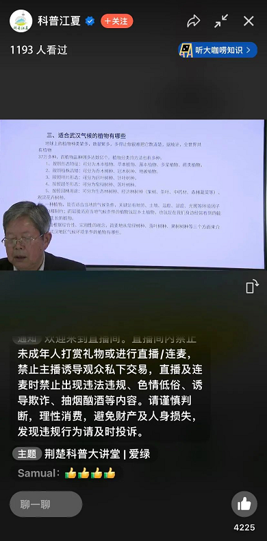 授课过程中,线上观众在评论区积极留言,绿色是生命的颜色,象征着生机与活力,孕育着理想与希望,爱绿护绿,必须从我做起!大家要爱护每一片绿叶,珍惜每一寸绿地,培养爱绿护绿的文明习惯,争做爱绿护绿的文明使者,营造爱绿护绿的良好氛围,让绿色生态变成武汉发展的最动人的色彩!