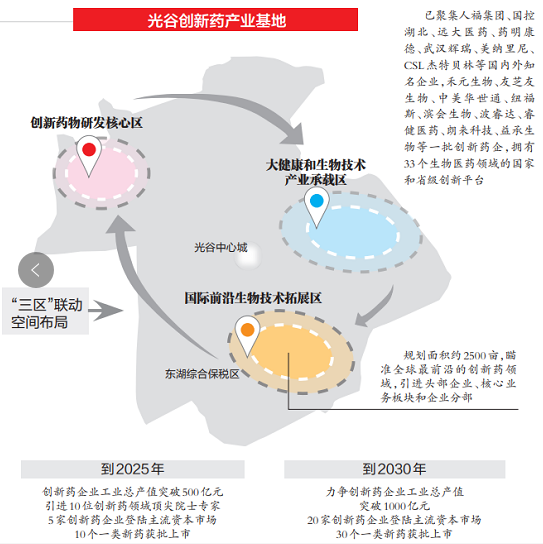 湖北东湖科学城·大健康和生物技术产业基地(光谷创新药产业基地),立足光谷生物城现有产业基础,规划建设创新药物研发核心区、大健康和生物技术产业承载区、国际前沿生物技术拓展区,致力打造具有全球影响力的创新药产业集群,力争到2030年,创新药企业工业总产值突破1000亿元,引进30位创新药领域顶尖院士专家,培育20家创新药上市企业,上市30个一类新药。