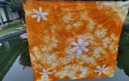 同学们更是将奇思妙想发挥于扎染图案中,当扎染遇上5·18就有了国际博物馆日纪念扎染T恤;当扎染遇上夏日就有了橙色花瓣扎染丝巾带来阵阵凉意;当扎染遇上秋日就有了既保暖又美观的扎染流苏围巾;当扎染遇上冬天便有了雪花的模样……