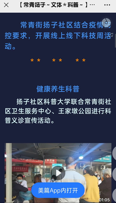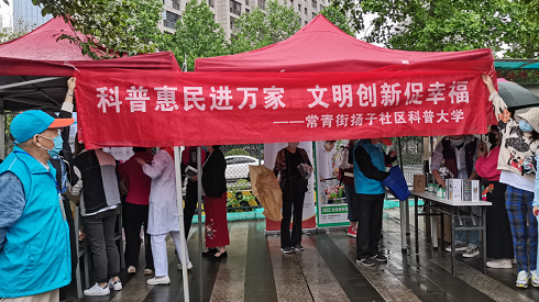 在常青街扬子社区,社区联合共建单位常青街卫生服务中心、王家墩公园,开展网络安全咨询和科学养生义诊的线上线下的全国科技周主题活动。常青街社区卫生服务中心门口,扬子社区值班律师张娟解答居民网络安全疑问,武汉市红十字会医院各类专家坐诊,免费为居民进行常规检查,科普医学常识和健康知识。还为居民进行家医签约、发放健教手册。王家墩公园门口,营养健康知识宣传有奖问答,发放《中国居民膳食指南》,通过现实事例为大家宣传科学、营养、平衡膳食相关知识,掌握科学烹饪技巧,形成正确养生意识和习惯,营造人人营养、全民健康的良好氛围。