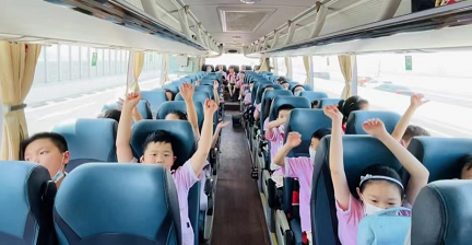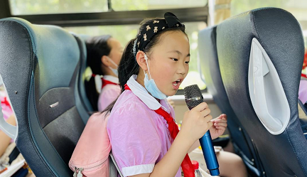 惠济路小学的同学们排着整齐的队伍、戴好口罩,登车前往中国建筑科技馆参观,路上领队老师带领同学们一起做游戏、才艺表演、互动问答……一路欢歌笑语,气氛活跃。
