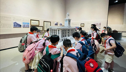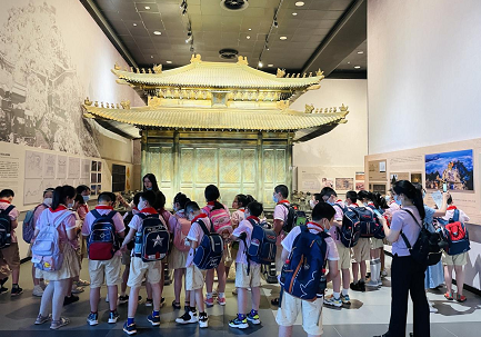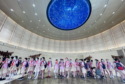 在领队老师的带领下,大家有序进馆。讲解员带领大家一边参观,一边了解不同时代建筑所反映的时代特征和时代文化。青少年们在参观过程中眼里充满了好奇,不停地在思考、记录、讨论。每位同学都被眼前的建筑所吸引。未来馆4D立体投影仪中间的影像变换流转间光彩熠动、气势恢宏,令学生们震撼不已。